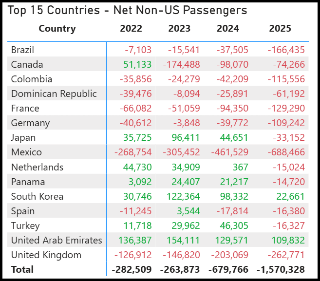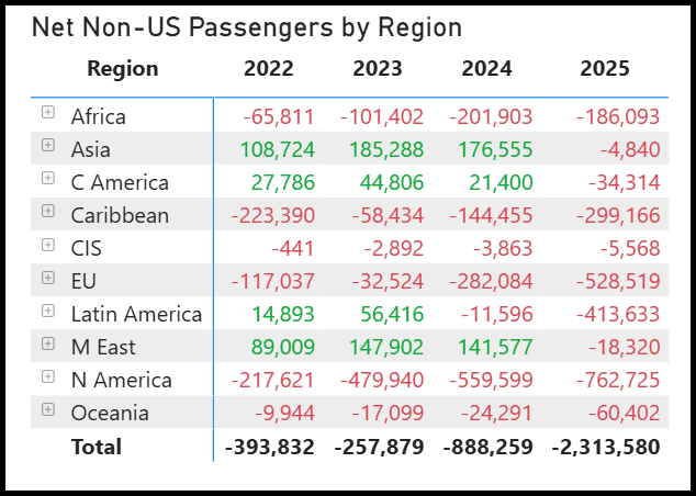 But, as always, the devil is in the details. Take a look at the table below. Let’s focus on visitors and ignore US citizens.  At first glance, it looks awful with a lot of red. The calculation is arrivals minus departures.  A green number indicates that more arrivals than departures occurred.
