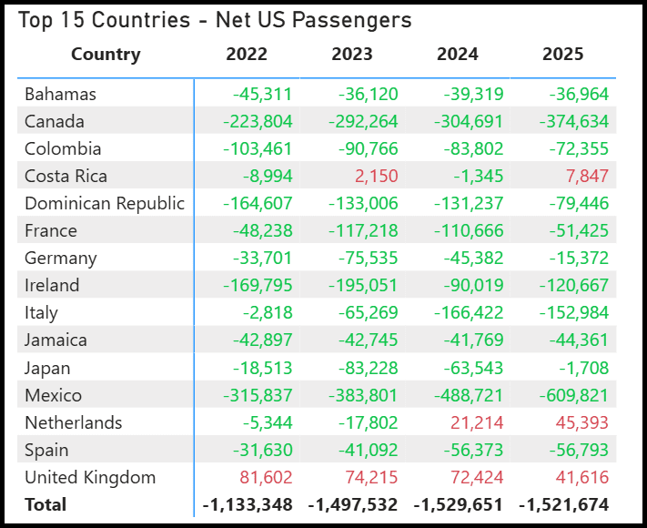 Over the past four years, US traffic abroad has exceeded inbound visitor traffic. In 2025, that remained true, but traffic volumes dropped off.