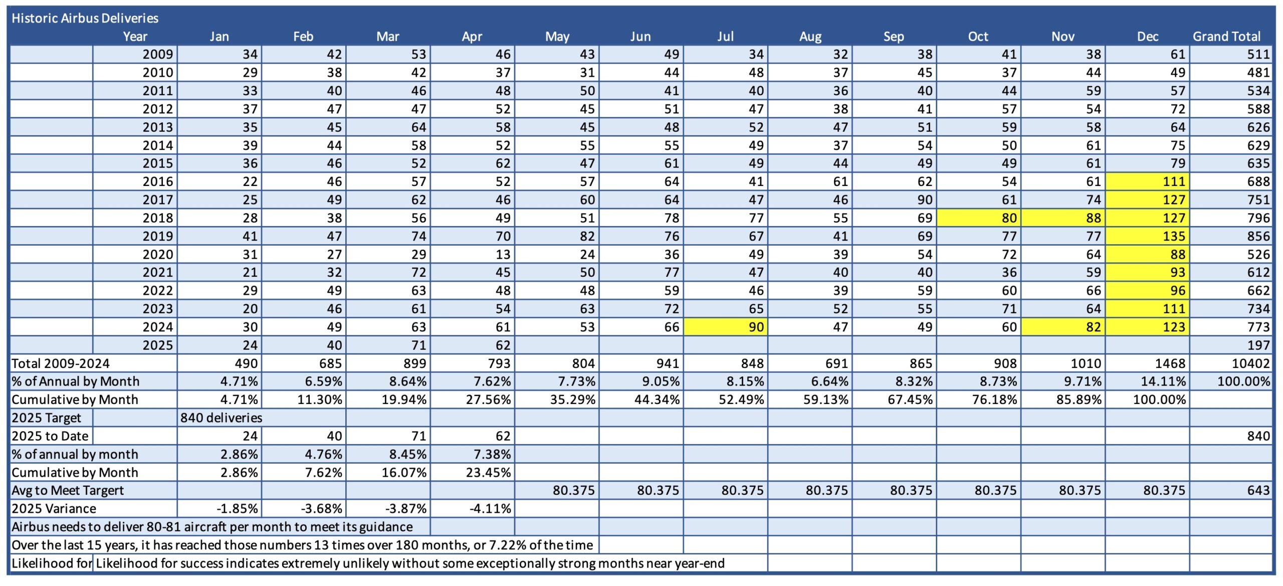 Airbus Historical Delivery analysis for likelihood of meeting 2025 guidance