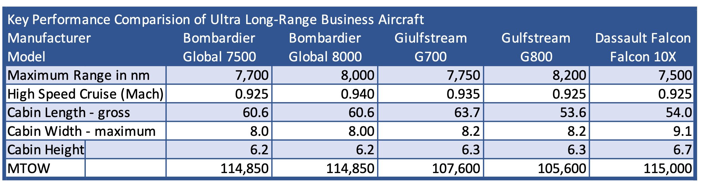 Ultra long range business aircraft comparison