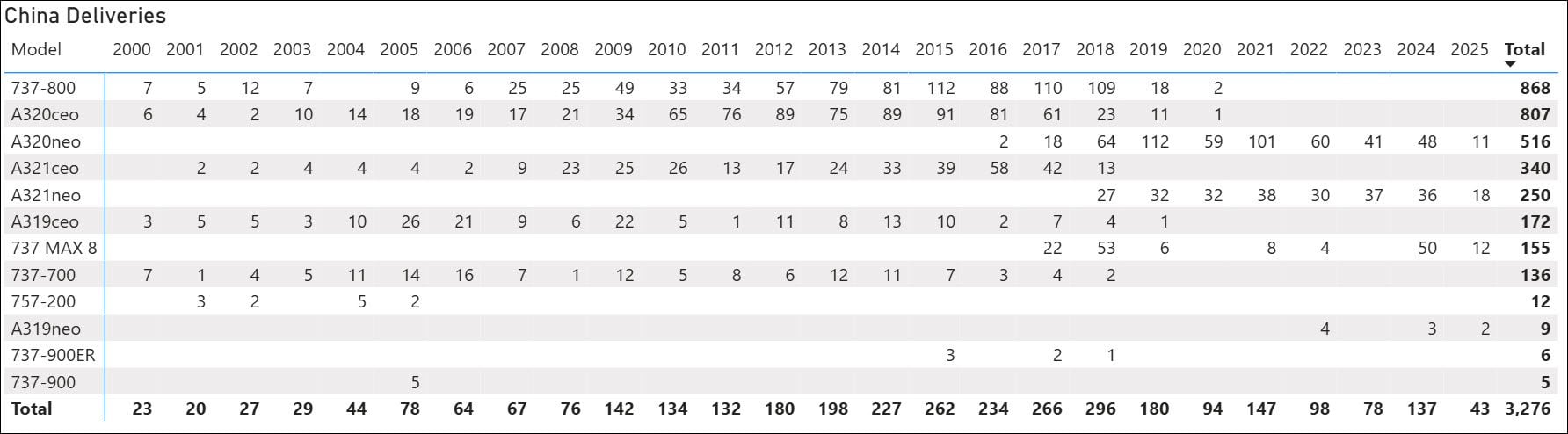 China single-aisle deliveries