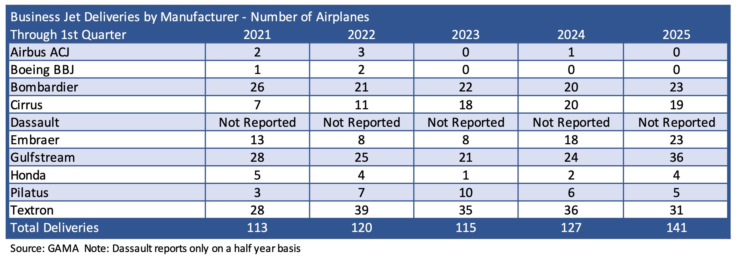General Aviation Aircraft Shipments Chart for 1Q 2025
