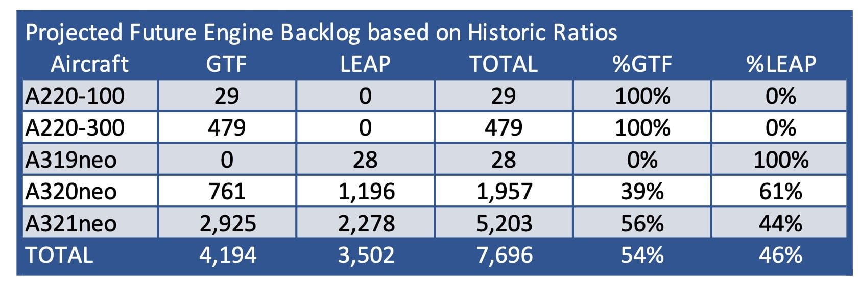 Projected Airbus NB engines based on backlog and customer preferences