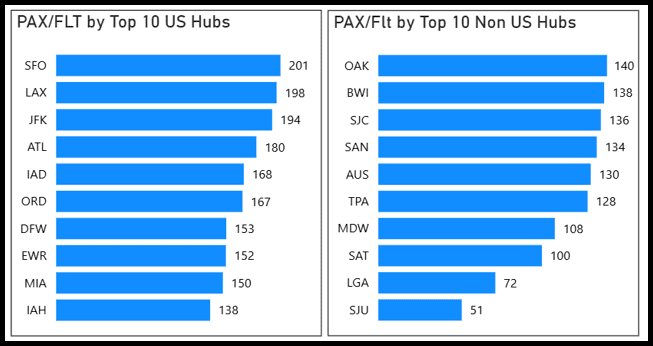 Here we see the average loads per flight for the top ten US Hubs and Non-Hubs.