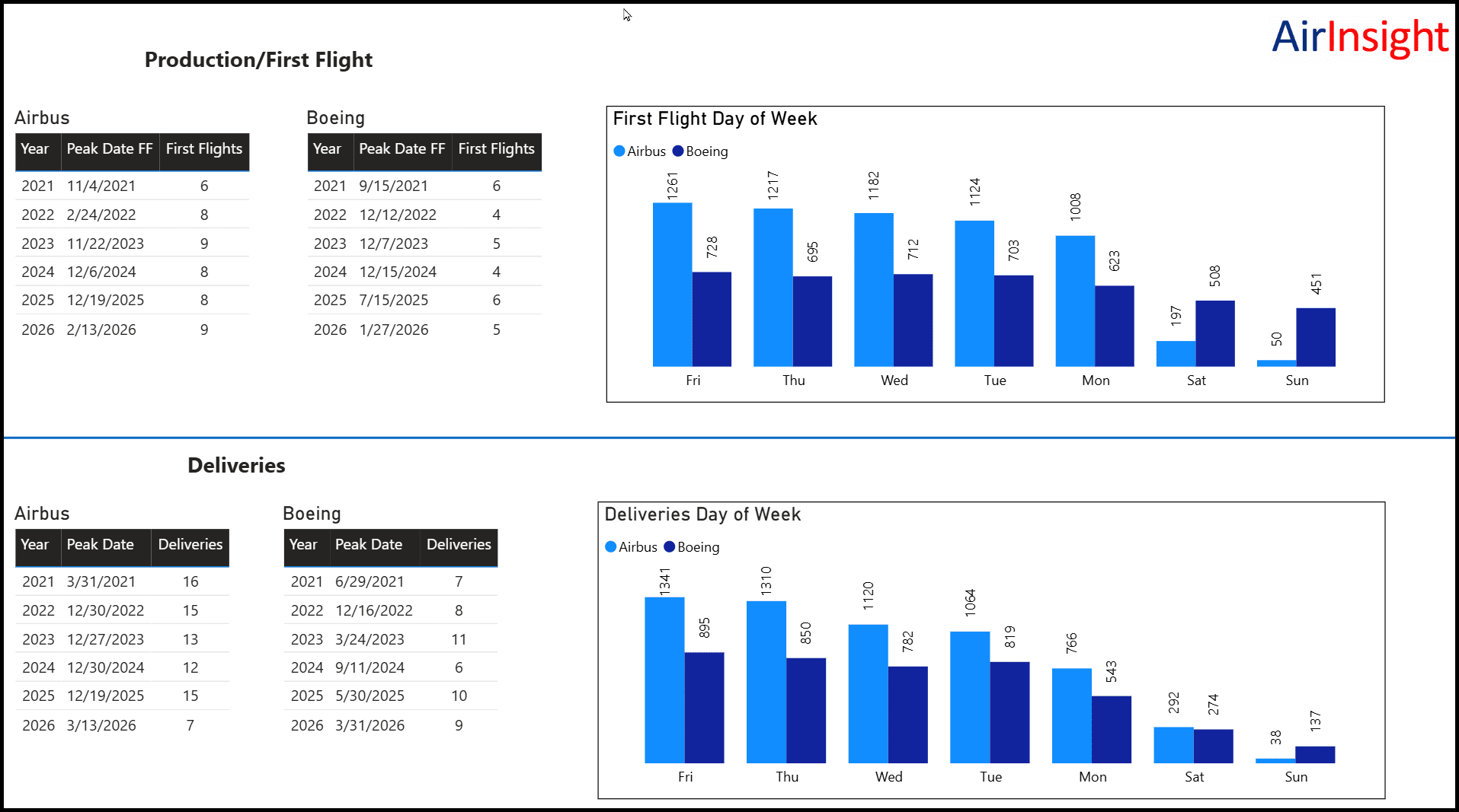 On deliveries, both converge on business days. Friday leads for both Airbus and Boeing. Sunday drops to 38 for Airbus and 137 for Boeing. Customer acceptance teams, paperwork, and ferry crews follow the working week even when the factory floor doesn’t.